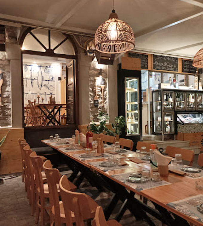 Το εσωτερικό του είναι πολύ προσεγμένο, όμορφα διακοσμημένο, με κυρίαρχο στοιχείο την σκαλιστή πέτρα, αρκετά λουλούδια, και ευχάριστο φωτισμό, που παραπέμπει σε ακριβό εστιατόριο, ενώ ο εξωτερικός, τόσο η αυλή του όσο και τα τραπεζάκια που βγάζει στον πεζόδρομο, το καλοκαίρι δημιουργούν ένα ιδανικό σκηνικό, με φόντο την εκκλησία του Αγίου Κωνσταντίνου. Ακριβώς δίπλα είναι η παιδική χαρά, που το κάνει βολικό σημείο για οικογένειες, να παίζουν τα παιδιά και οι μεγάλοι να πίνουν το τσιπουράκι τους. Τα καλαμαράκια είναι σωστά τηγανισμένα και μαλακά, ωραίο το καρπάτσιο τόνου, όπως και η πεσκανδρίτσα, ενώ το σαγανάκι γαρίδα φλαμπέ με πεπαλαιωμένο τσίπουρο, ωδή στον ουρανίσκο. Ακόμη, θα μπορέσετε να δοκιμάσετε καλομαγειρεμένο φαγητό.