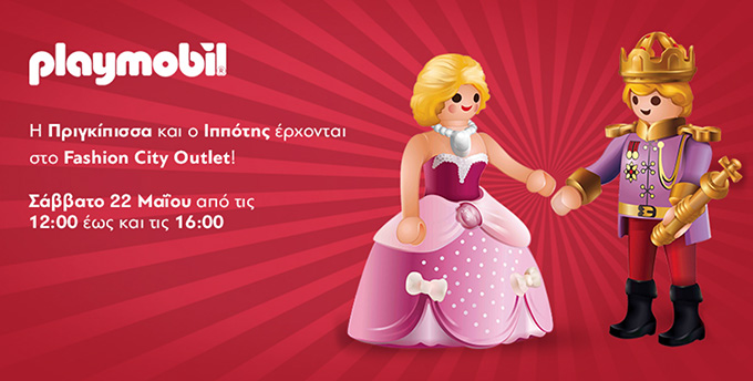 Στους διαδρόμους του Fashion City Outlet "βολτάρουν" οι μασκότ της Playmobil!Το Σάββατο 22 Μαΐου από τις 12:00 μέχρι τις 16:00, δύο μασκότ-έκπληξη από τις φιγούρες της Playmobil θα βρίσκονται στους διαδρόμους του Εκπτωτικού Κέντρου, για να χαιρετίσουν τους μικρούς αλλά και τους μεγάλους φίλους τους.