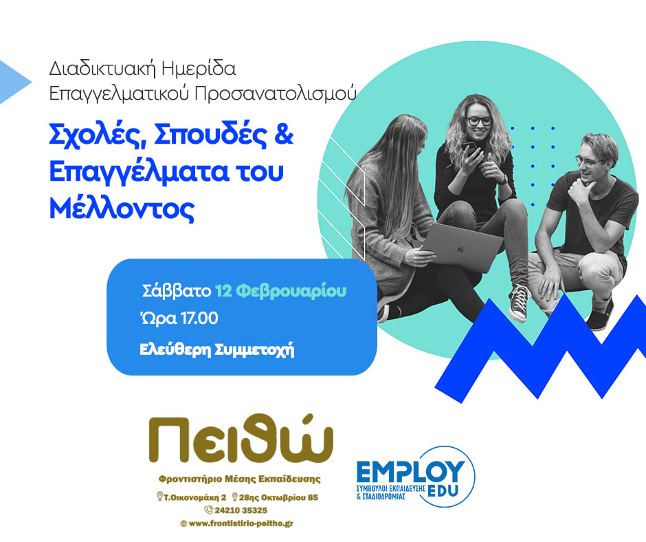 Το Φροντιστήριο ΠΕΙΘΩ λαμβάνοντας υπόψη τις σημαντικές αλλαγές & την ανάγκη για έγκυρη και έγκριτη ενημέρωση των μαθητών διοργανώνει διαδικτυακό σεμινάριο Επαγγελματικού Προσανατολισμού σε συνεργασία με την έμπειρη & καταξιωμένη επιστημονική ομάδα της EMPLOY EDU Σύμβουλοι Εκπαίδευσης & Σταδιοδρομίας.