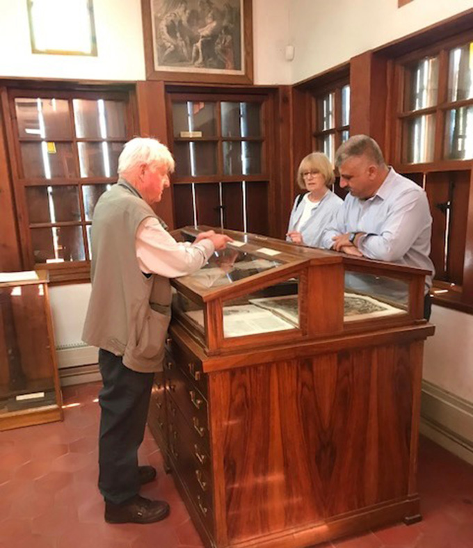 Στη συνέχεια επισκέφθηκε τη μοναδική Βιβλιοθήκη Μηλεών “Ψυχής Άκος” την οποία ίδρυσαν το 1814 ο Άνθιμος Γαζής, ο Γρηγόριος Κωνσταντάς και ο Δανιήλ Φιλιππίδης, τρεις από τους σημαντικότερους εκπροσώπους του Νεοελληνικού Διαφωτισμού. Η Βιβλιοθήκη φιλοξενεί 3.355 παλαιά βιβλία, 116 χειρόγραφα βιβλία, τα περισσότερα του 18ου αιώνα, ενώ υπάρχουν και φύλλα από κώδικες του 10ου, 11ου και 12ου αιώνα, μεταξύ άλλων σπάνια βιβλία με έργα του Αριστοφάνη από τον 15ο αι. και αντίτυπο της Εγκυκλοπαίδειας του Γάλλου Διαφωτιστή Ντιντερό από τον 18ο αι. Επίσης, φυλάσσονται 1.000 περίπου λυτά έγγραφα και αντικείμενα σημαντικού ιστορικού ενδιαφέροντος που ανήκαν στη φημισμένη Μηλιώτικη Σχολή.