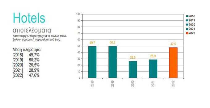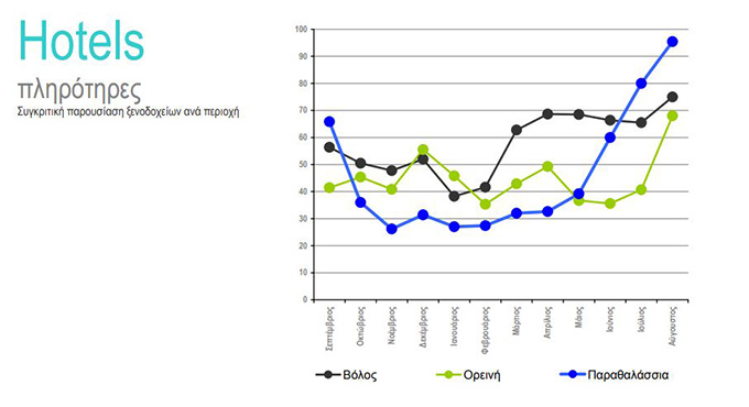 Τα ξενοδοχεία στον ορεινό Δήμο Βόλου δούλεψαν όπως και το 2019, στο κέντρο της πόλης ώθηση στα τουριστικά καταλύματα έδωσε η έκρηξη των μαθητικών εκδρομών την άνοιξη, ενώ το αξιοσημείωτο για τις παραθαλάσσιες περιοχές είναι ότι πέτυχαν τριπλασιασμό της πληρότητας, στο 30% έναντι 10% προηγούμενες χρονιές, το χρονικό διάστημα από Νοέμβριο έως Απρίλιο, γεγονός που δείχνει άμβλυνση της εποχικότητας.