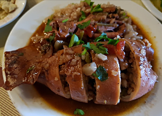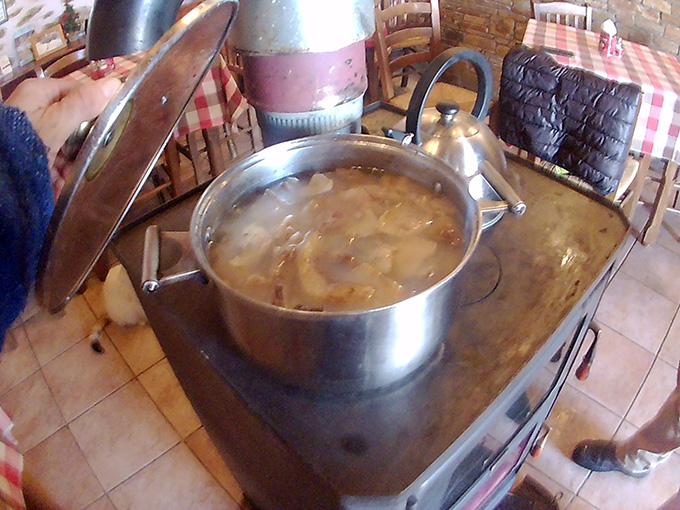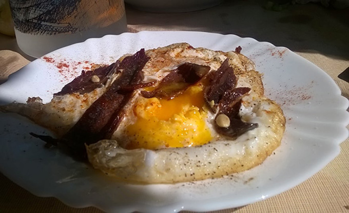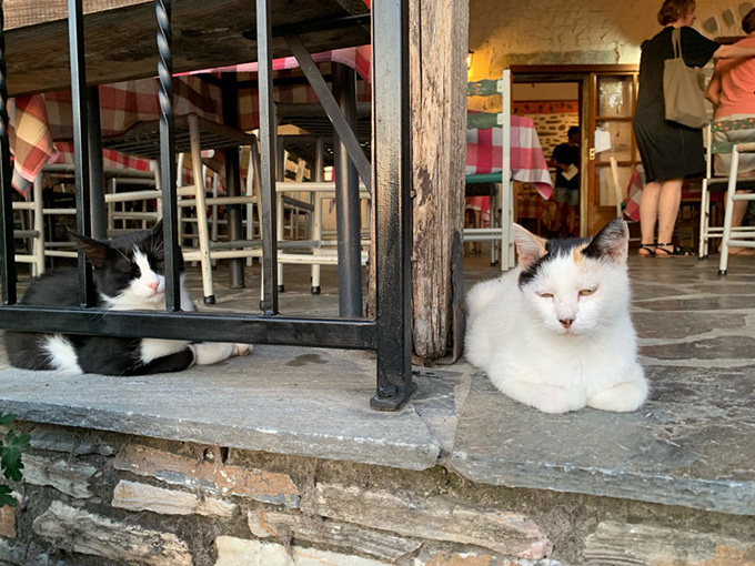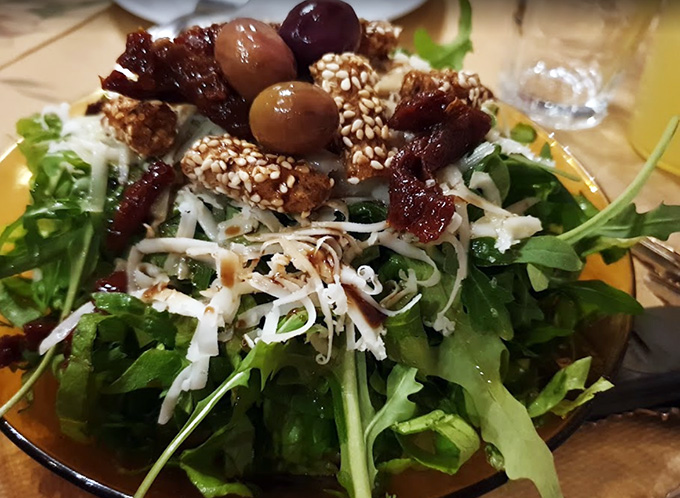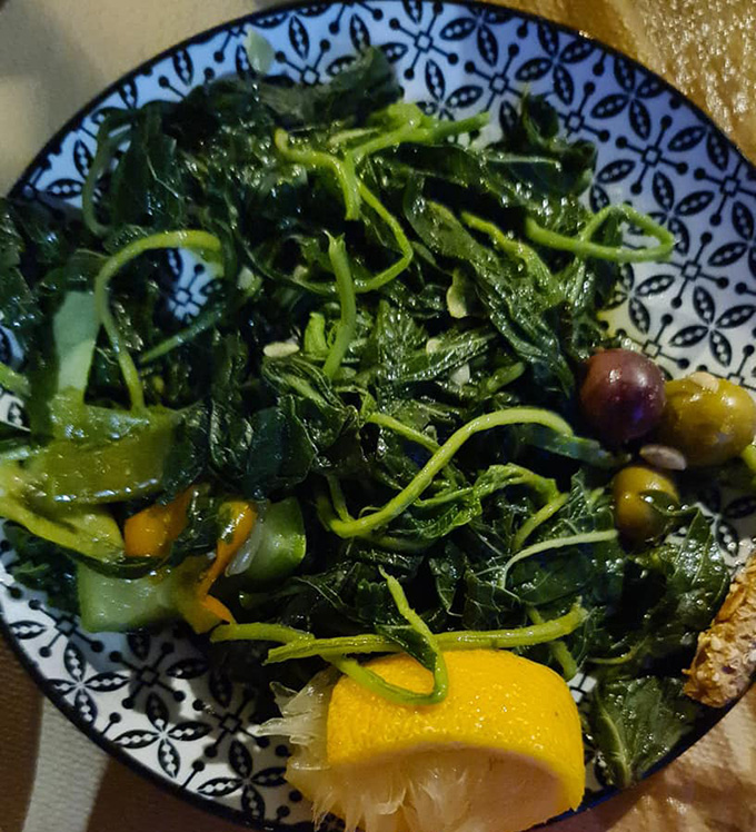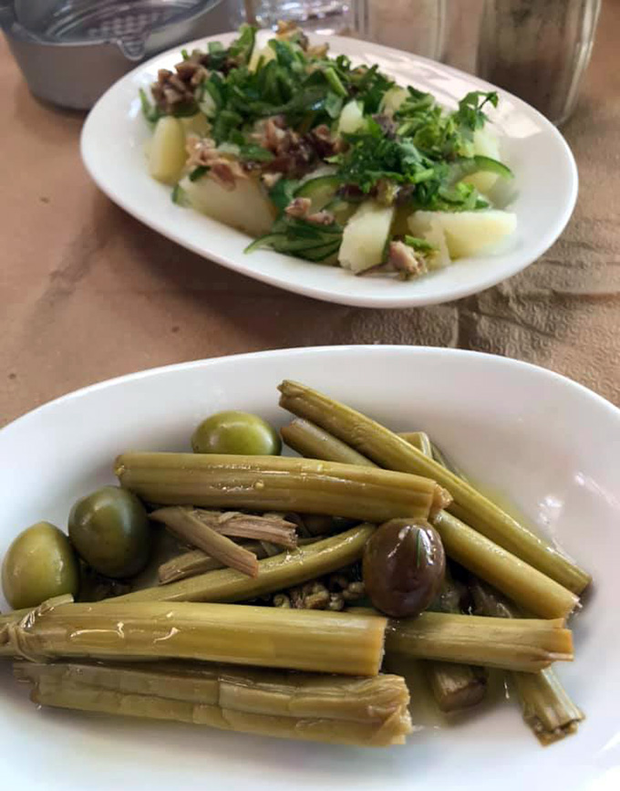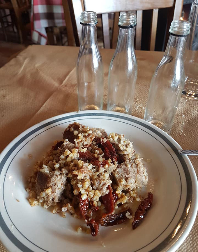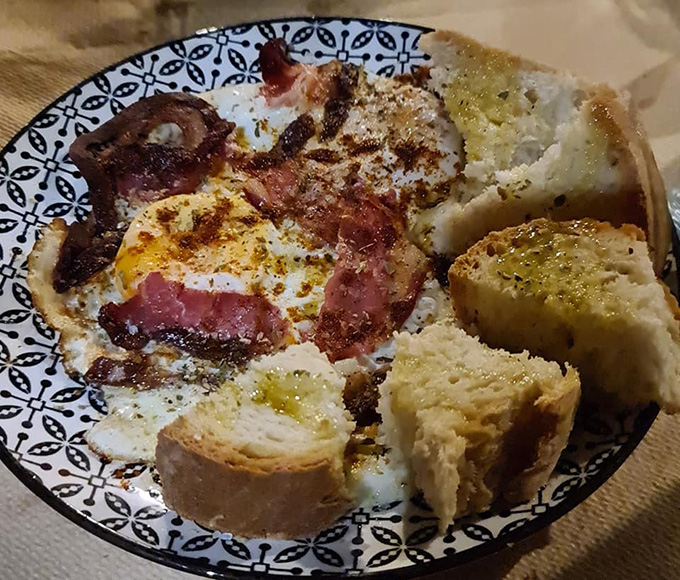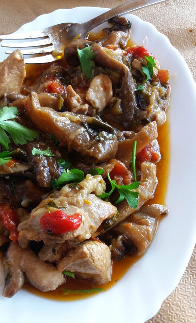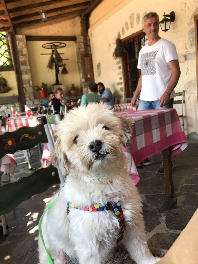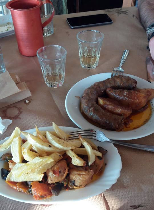 Τραγόπουλο λεμονάτο με πατάτες τηγανητές, μανιτάρια φρικασέ, κεφτέδες τηγανητούς, αυγά με χόρτα, αγριογούρουνο με κυδώνια, πορτοκάλι και σταφίδες, πρόβατο τσιγαριστό με ντομάτα και πατάτες τηγανητές σε ελαιόλαδο. Στο τέλος, γιαούρτι με ψητό πορτοκάλι!