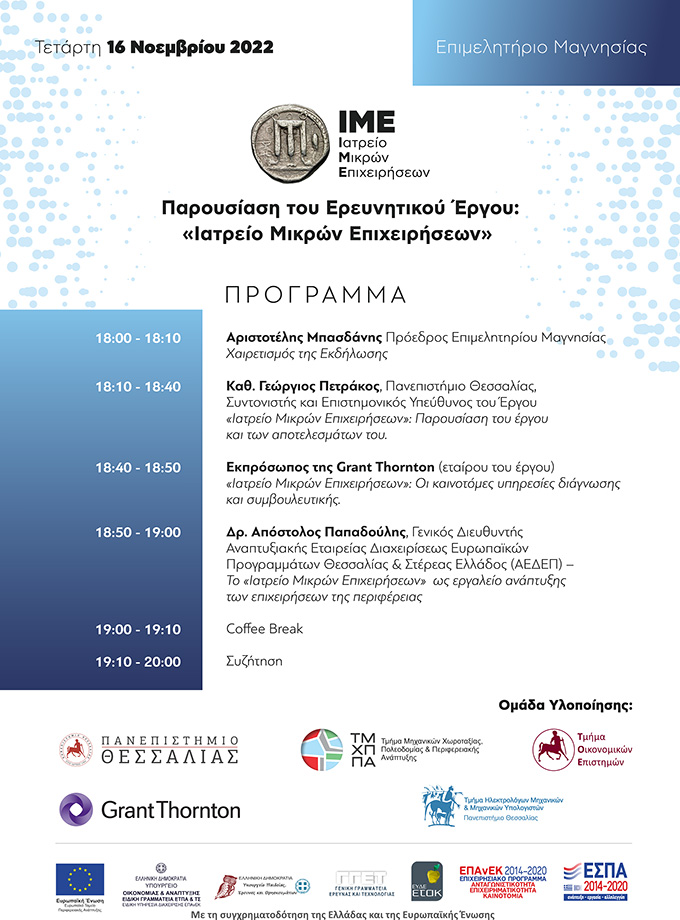 Παρουσίαση του ερευνητικού έργου “Ιατρείο Μικρών Επιχειρήσεων”Η ερευνητική ομάδα του Πανεπιστημίου Θεσσαλίας και η Grant Thorton παρουσιάζουν το έργο "Ιατρείο Μικρών Επιχειρήσεων". Ένα on-line εργαλείο διάγνωσης και συμβουλευτικής των μικρών επιχειρήσεων. Την Τετάρτη 16 Νοεμβρίου 2022, στις 6 το απόγευμα στο Επιμελητήριο Μαγνησίας.