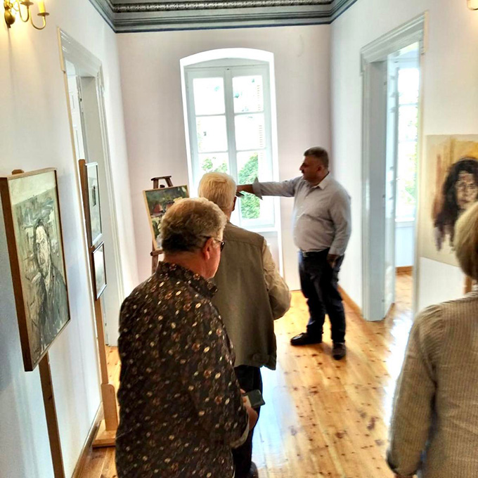 Αρχικά ξεναγήθηκε στο ξακουστό Μουσείο Νικόλα στον Άγιο Γεώργιο Νηλείας και στη συνέχεια στο Μουσείο Πολιτισμού «Κώστας Λιάπης» - Αρχοντικό Τζωρτζέϊκο, όπου φιλοξενούνται οι εκθέσεις των Richard Rafael Roland Risse και Κων. Κομνηνού.