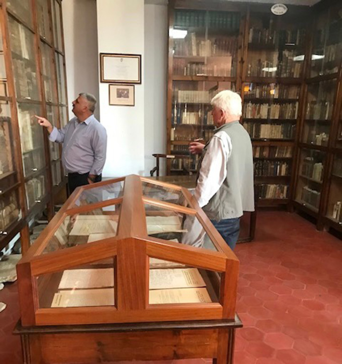 Στη συνέχεια επισκέφθηκε τη μοναδική Βιβλιοθήκη Μηλεών “Ψυχής Άκος” την οποία ίδρυσαν το 1814 ο Άνθιμος Γαζής, ο Γρηγόριος Κωνσταντάς και ο Δανιήλ Φιλιππίδης, τρεις από τους σημαντικότερους εκπροσώπους του Νεοελληνικού Διαφωτισμού. Η Βιβλιοθήκη φιλοξενεί 3.355 παλαιά βιβλία, 116 χειρόγραφα βιβλία, τα περισσότερα του 18ου αιώνα, ενώ υπάρχουν και φύλλα από κώδικες του 10ου, 11ου και 12ου αιώνα, μεταξύ άλλων σπάνια βιβλία με έργα του Αριστοφάνη από τον 15ο αι. και αντίτυπο της Εγκυκλοπαίδειας του Γάλλου Διαφωτιστή Ντιντερό από τον 18ο αι. Επίσης, φυλάσσονται 1.000 περίπου λυτά έγγραφα και αντικείμενα σημαντικού ιστορικού ενδιαφέροντος που ανήκαν στη φημισμένη Μηλιώτικη Σχολή.